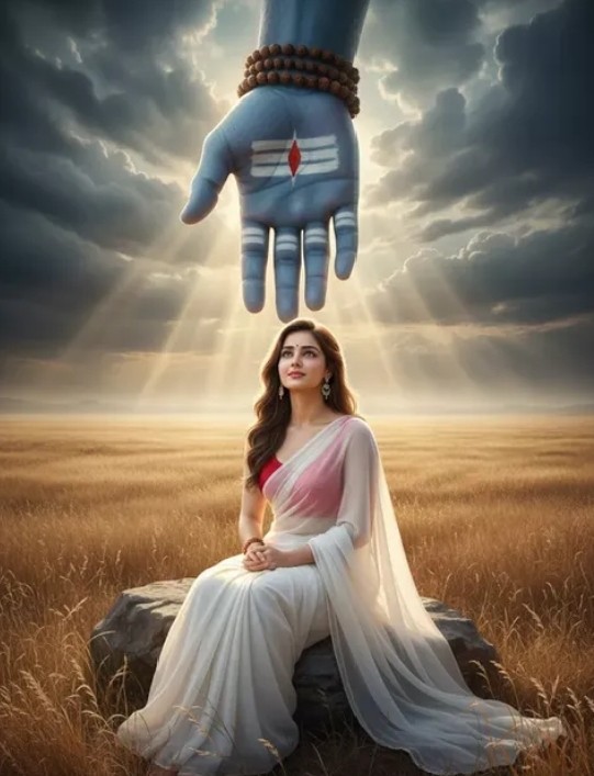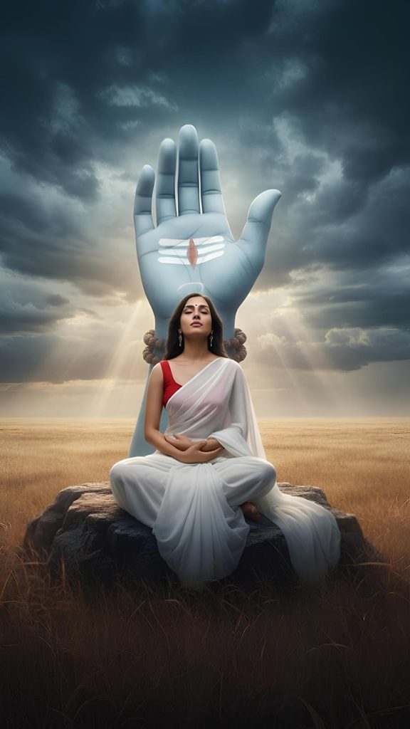 The photo portrays a woman in serene meditation, dressed in a flowing white saree, seated on a rock in the middle of a vast golden field. Behind her rises a monumental blue hand, symbolizing divine protection and blessings, with beams of light breaking through the stormy sky. This edit doesn’t just enhance the original photo—it reimagines it into a narrative of peace, faith, and transcendence.